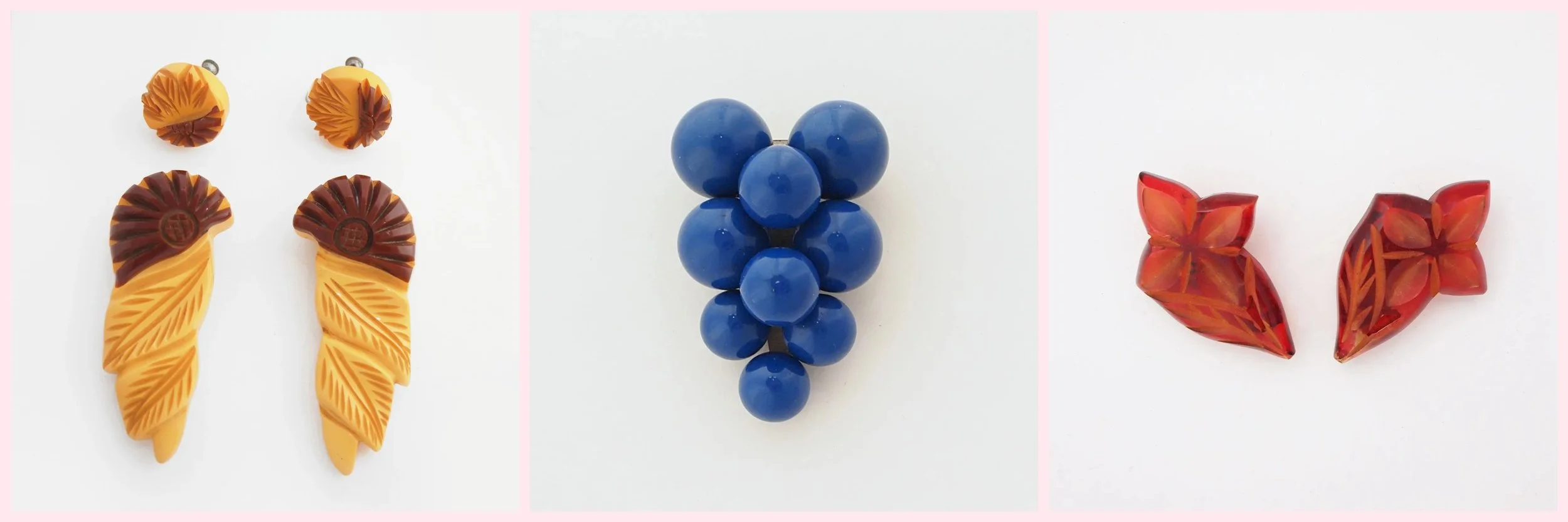 Several of the dress clips from my shop inventory, made of carved Bakelite and enameled wood.
