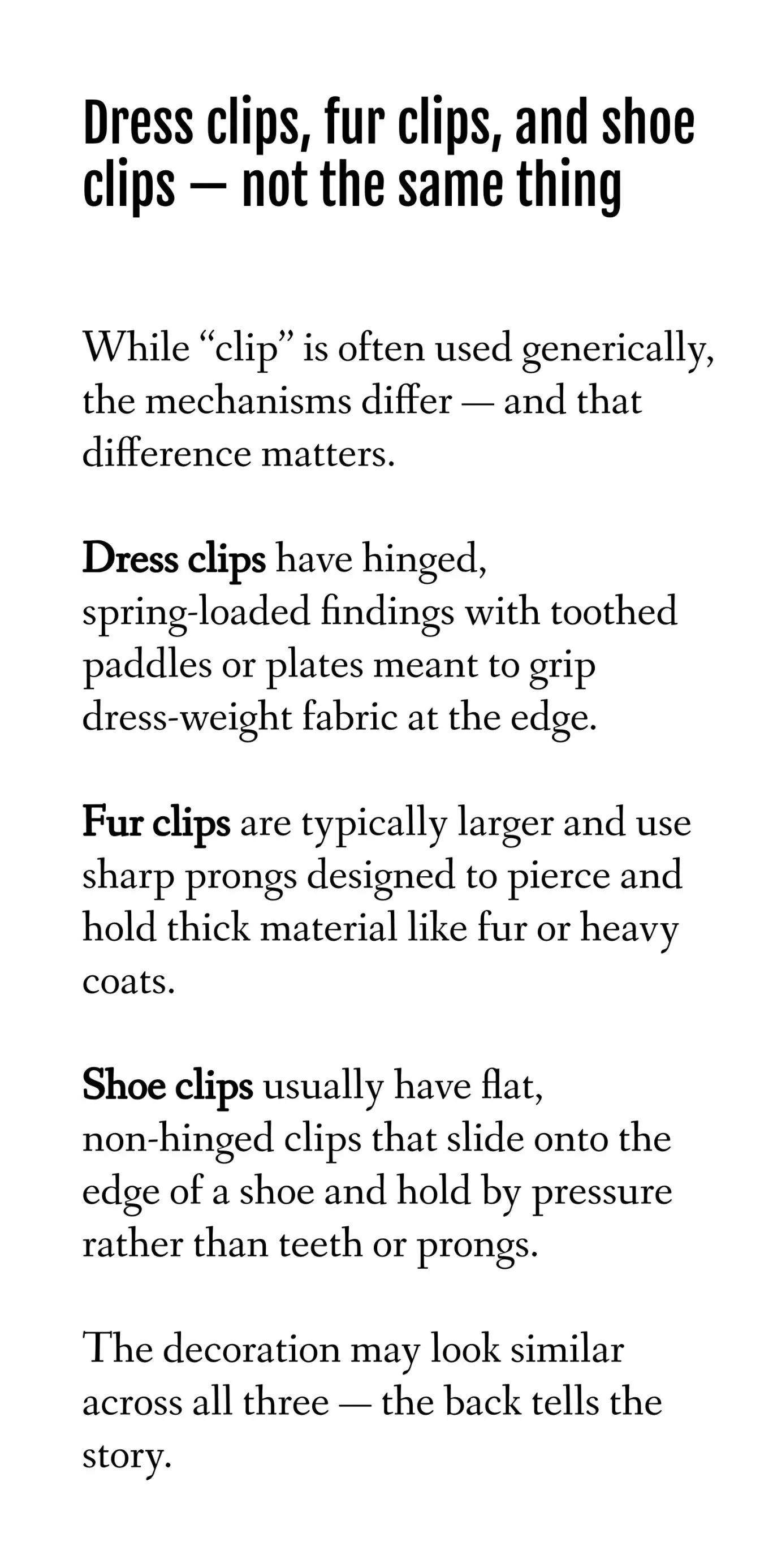 That edge-gripping function is the key difference. Dress clips were made for places a traditional brooch pin can’t easily — or safely — go.
